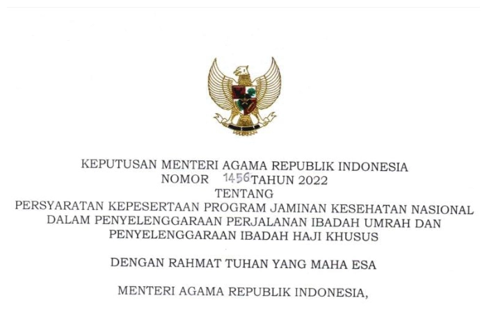 Ketentuan tersebut sebagaimana tertuang di dalam Keputusan Menteri Agama (KMA) Nomor 1456 Tahun 2022 tentang Persyaratan Kepesertaan JKN dalam Penyelenggaraan Perjalanan Umrah dan Haji Khusus, yang ditandatangani Menteri Agama, Yaqut Cholil Qoumas pada 21 Desember 2022.